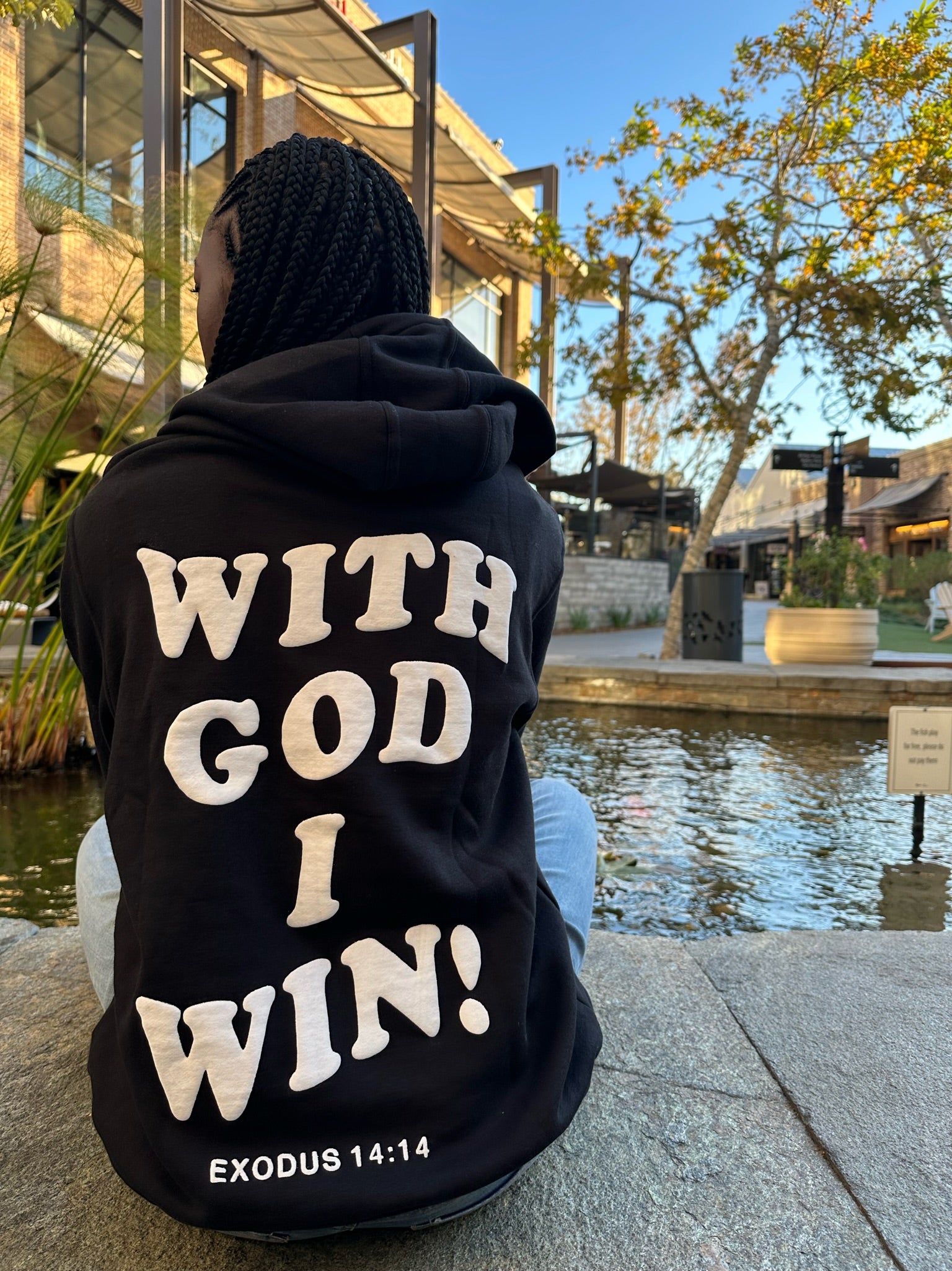 The hoodie features a minimalistic design on the front and a very bold Puff Printed design on the back. The hood is lined with satin, which offers great protection for your hair. Our signature verse, Exodus 14:14, is embroidered and the bottom of the left sleeve.